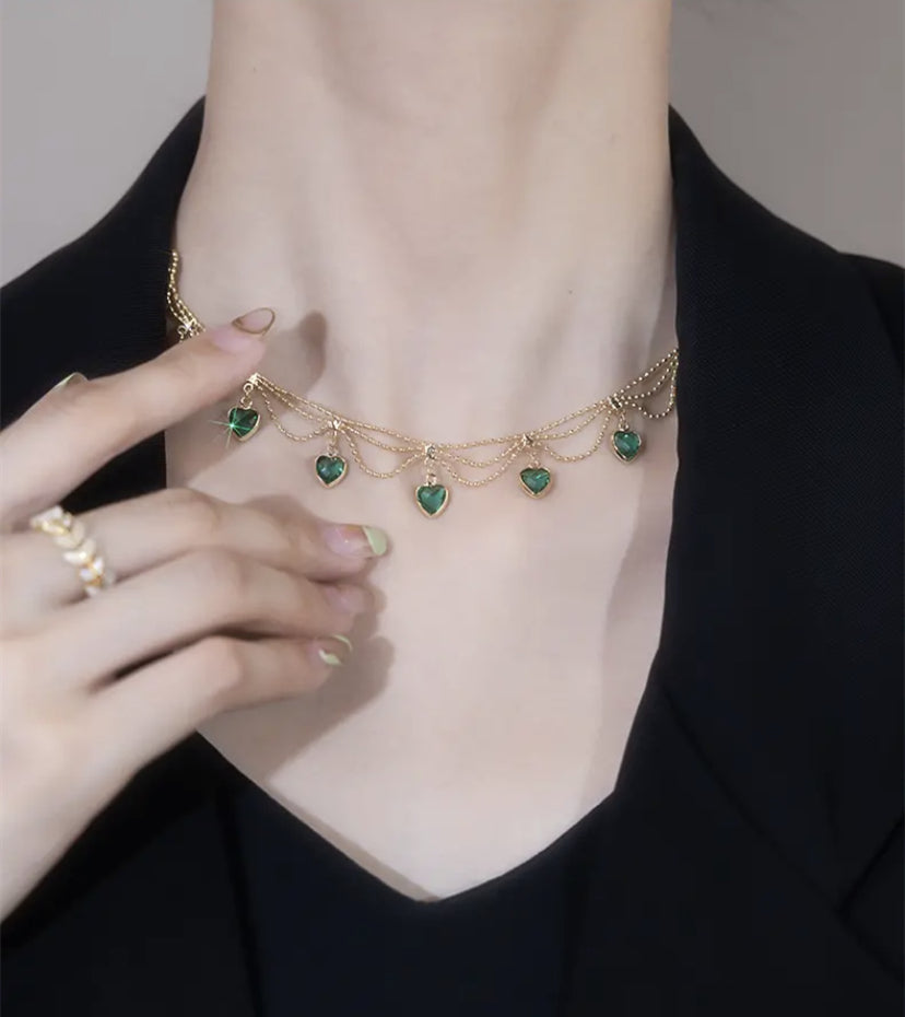 Ten naszyjnik z krysztaĆami w ksztaĆcie zielonego serca podkreĆla delikatnoĆÄ szyi i modnÄ