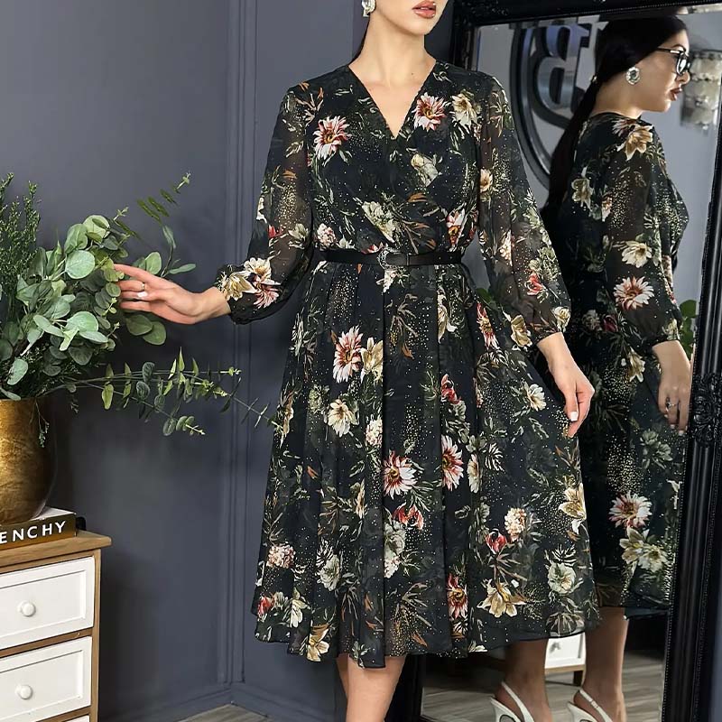Głęboki dekolt w kształcie litery V wydłuża dekolt i podkreśla zgrabne obojczyki, zapewniając pochlebny wygląd, który jest zarówno swobodny, jak i formalny.